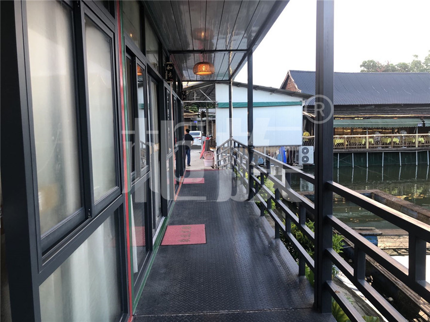 產(chǎn)品用材:鍍鋅方管框架、鋼化玻璃門窗、鋁花紋板走廊、生態(tài)木地板。